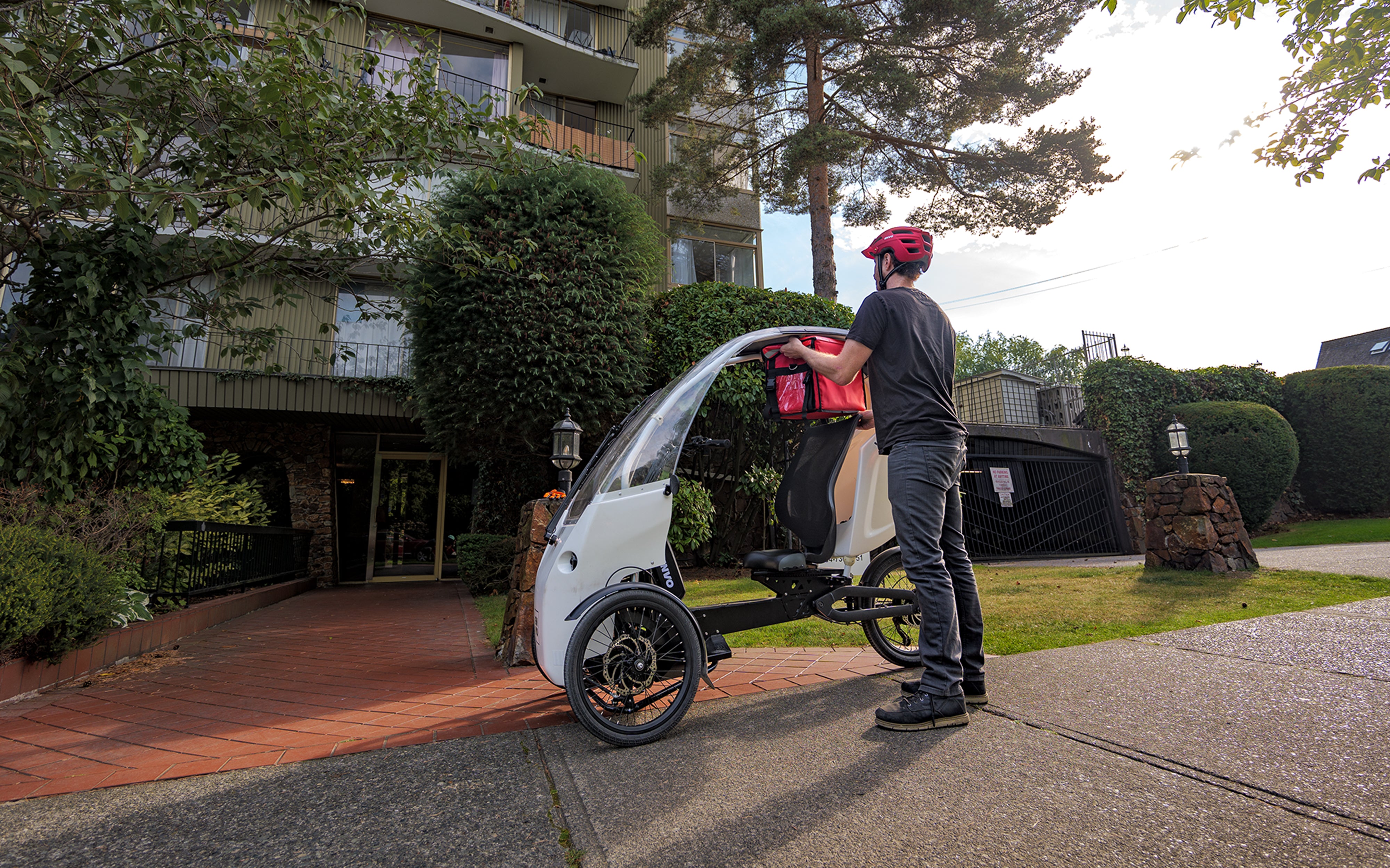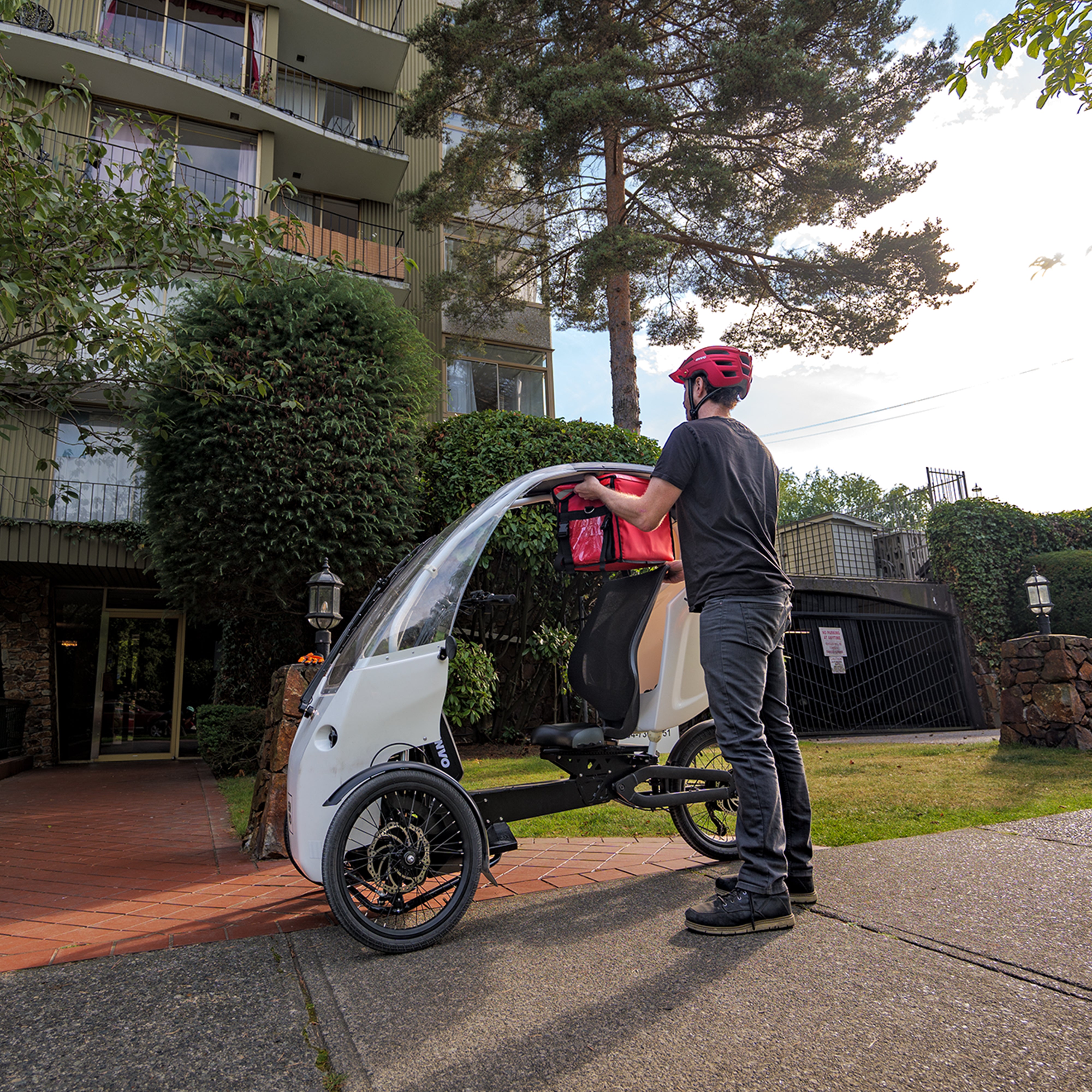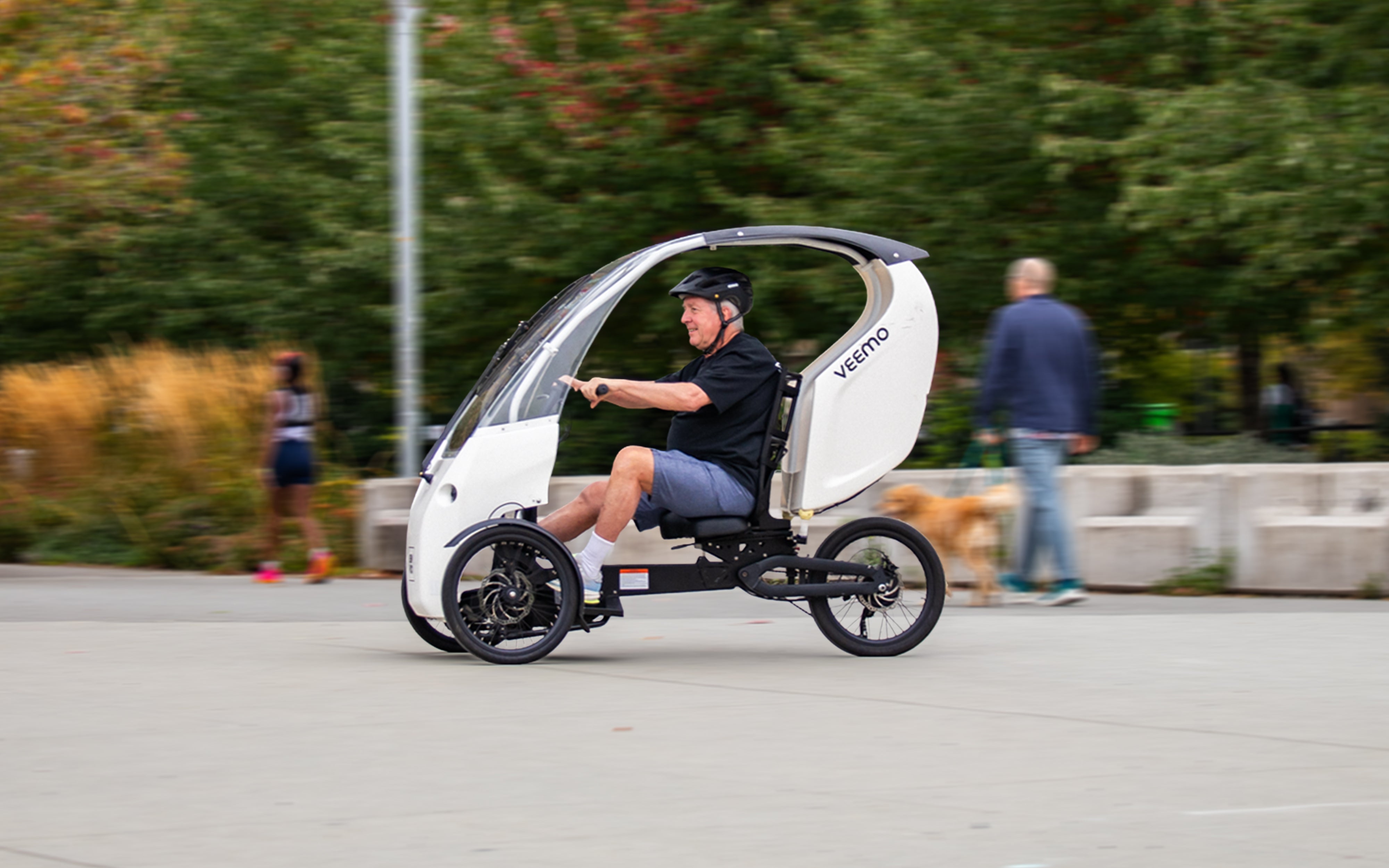 Combining the efficiency of an e-bike with the protection and comfort of a car, Veemo features pedal assist, throttle control, weatherproofing, ample storage, and a full size seat with a backrest. Its compact design and zero-emission operation make it perfect for navigating city streets while supporting a healthier, more sustainable community.